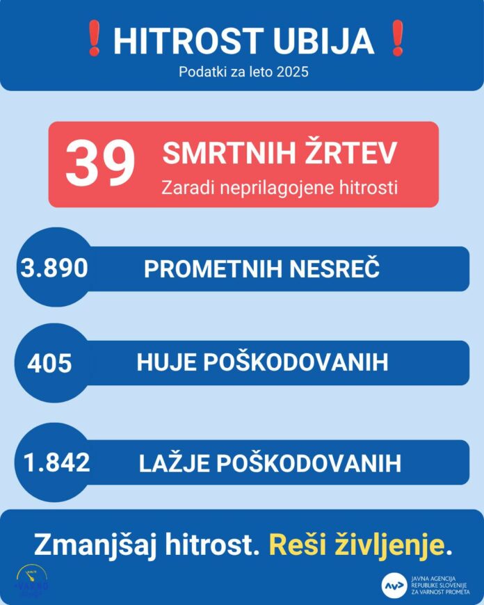 Glavni vzrok prometnih nesreč s smrtnim izidom je še vedno neprilagojena hitrost. Lani je zaradi nje umrlo 39 ljudi, o eni prometni nesreči s smrtnim izidom smo poročali pred dnevi. Zato ne hitite. Tistih nekaj sekund ne odtehta tveganja življenja.